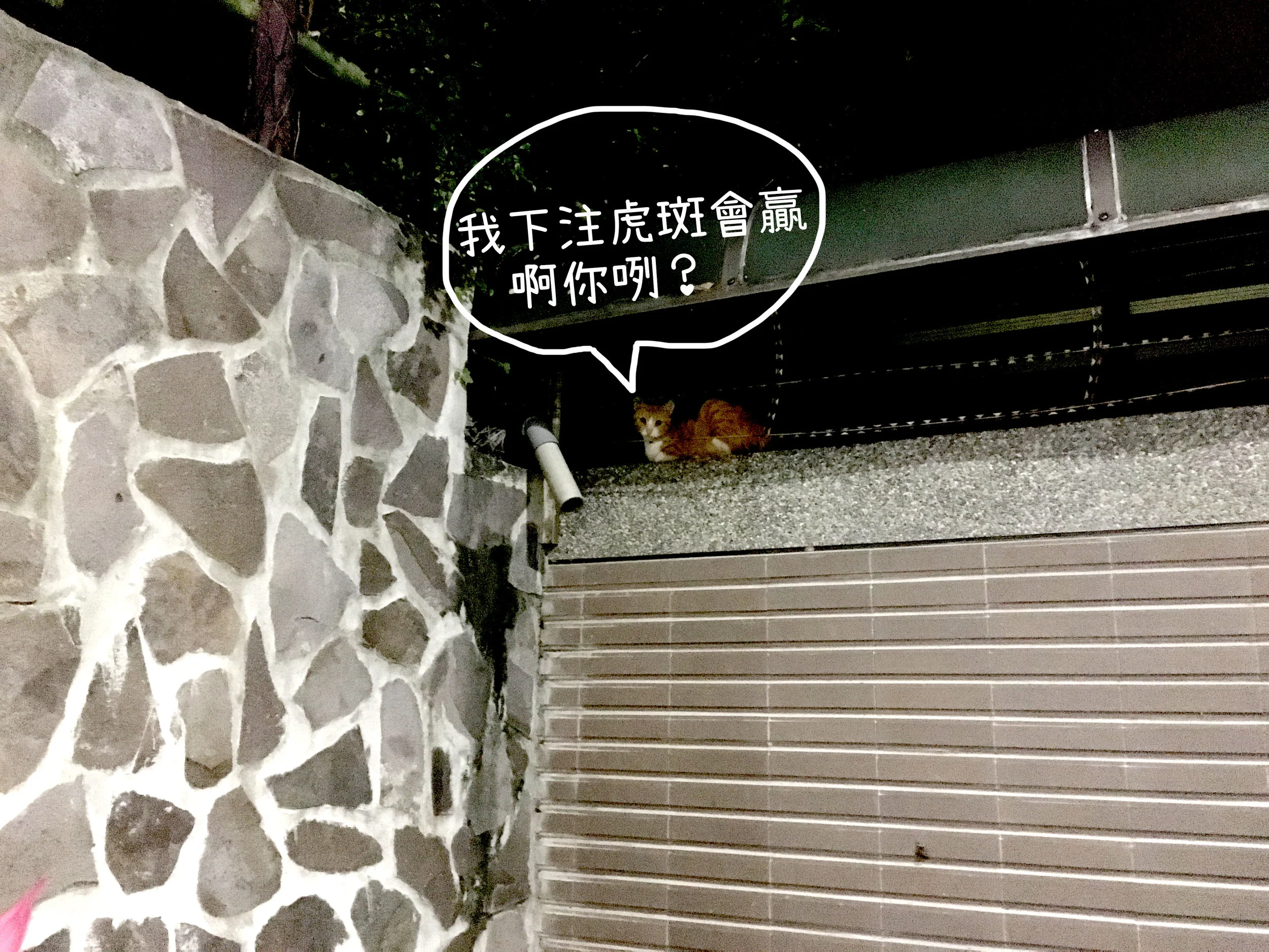 故事要從很久很久以前說起,從前有戶好心人家住在半山腰的透天厝,透天厝附近有著許多浪貓,大大貓帶著小小貓,小小貓又叼著小小小貓,通通都來吃這戶好心人家的飯,只要好心人家一開門他們就會湊到門前喵喵喵喵喵喵喵~~~~~好心人家被搶劫慣了就乾脆固定在門口放個碗,出門前放乾乾回家後在放乾乾,放一放就成了習慣,公公前幾年走了,現在第二代掌門人跟媳婦也不敢造次,持續向這群浪貓們進貢。